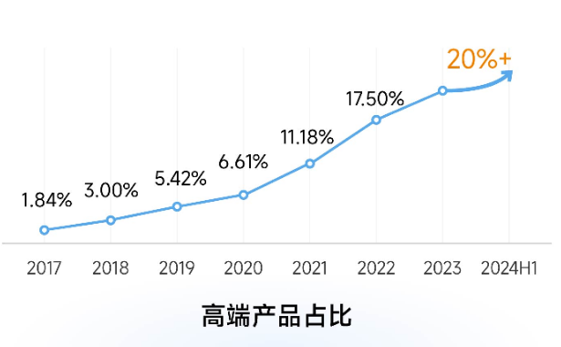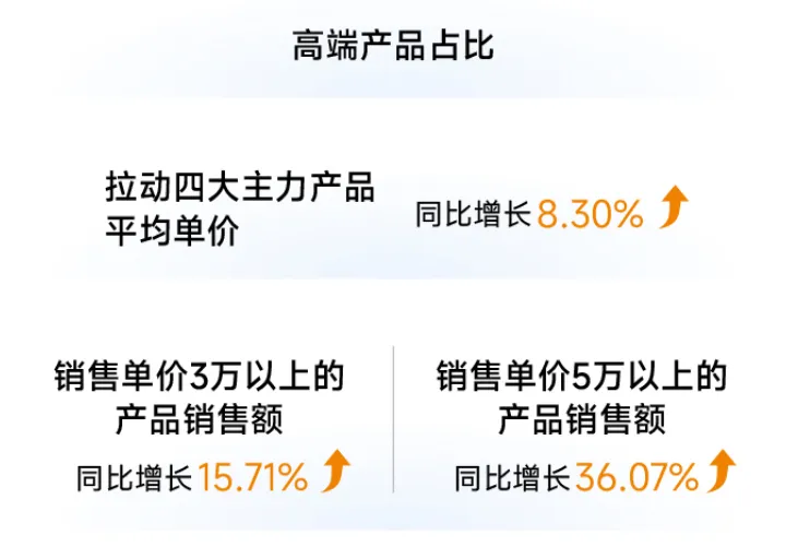 報告顯示,公司2024年上半年期間,高端產(chǎn)品銷售占比達(dá)到20%以上,而其具象化在產(chǎn)品銷售上,則表現(xiàn)為"單價越高的產(chǎn)品,銷售額增長越快”:銷售單價3萬以上的產(chǎn)品銷售額同比增長15.71%,銷售單價5萬以上的產(chǎn)品銷售額同比增長36.07%。