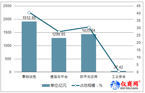 2017年中國(guó)工業(yè)互聯(lián)網(wǎng)細(xì)分領(lǐng)域結(jié)構(gòu)情況中,基礎(chǔ)設(shè)施規(guī)模達(dá)到1912.89億元,占總規(guī)模的40.9%;軟件與應(yīng)用規(guī)模達(dá)到1435.84億元,占比為30.7%;通信與平臺(tái)的規(guī)模為1290.85億元,占比為27.6%;工業(yè)安全為37.42億元,占總規(guī)模的0.8%。