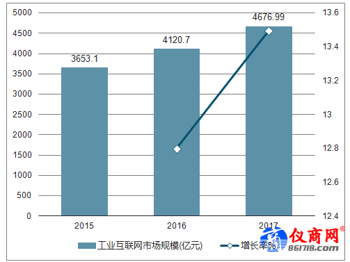 2017年中國(guó)工業(yè)互聯(lián)網(wǎng)市場(chǎng)規(guī)模達(dá)到4676.99億元,增長(zhǎng)率為13.5。