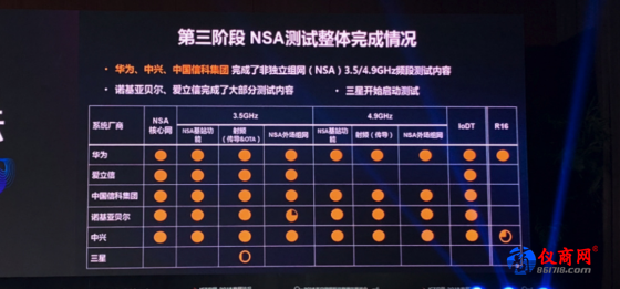 據(jù)介紹,在三階段測試中,NSA測試內(nèi)容包括,室內(nèi)測試、核心網(wǎng)功能、基站功能、外場測試等。華為、中興、中國信科完成了NSA 3.5GHz、4.9GHz頻段測試內(nèi)容,諾基亞貝爾、愛立信完成了大部分測試內(nèi)容,三星啟動測試。