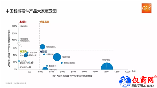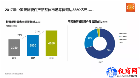 2017年智能硬件產(chǎn)品整體市場(除手機(jī))零售額達(dá)3850億元,同比增長27%,傳統(tǒng)家電智能化成為主要推動(dòng)力,其中智能家電類產(chǎn)品零售額占整體市場的70%。