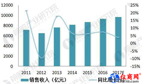 圖表1:2011-2017年中國儀器儀表制造業(yè)銷售收入及增長情況(單位:億元,%)