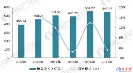 前瞻產(chǎn)業(yè)研究院《2018-2023年中國(guó)干式變壓器行業(yè)市場(chǎng)需求預(yù)測(cè)與投資戰(zhàn)略規(guī)劃分析報(bào)告》數(shù)據(jù)顯示,近年來(lái)我國(guó)干式變壓器的整體市場(chǎng)規(guī)模波動(dòng)較小,2013年以后,整體維持在450億元以上。受2015年行業(yè)整體波動(dòng)及產(chǎn)量下降的影響,干式變壓器的銷售收入下降至493.77億元,同比下降2.13%。隨后行業(yè)的規(guī)模有所提升,至2017年國(guó)內(nèi)干式變壓器行業(yè)的銷售收入達(dá)到547.47億元。