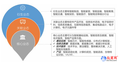 通過對(duì)人工智能產(chǎn)業(yè)分布進(jìn)行梳理,提出了人工智能產(chǎn)業(yè)生態(tài)圖,主要分為 核心業(yè)態(tài)、關(guān)聯(lián)業(yè)態(tài)、衍生業(yè)態(tài)三個(gè)層次。