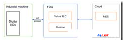 一個典型的實現(xiàn)架構(gòu)是:首先具有一臺工業(yè)機器,可以用來測試整個生產(chǎn)過程。這臺機器可以看作是一套可以通過OT控制協(xié)議控制的輸入和輸出。這是理想的實時協(xié)議,因為它確保消息在一定的時間窗內(nèi)到達。然后開發(fā)一個霧計算或邊緣計算層,通過工業(yè)控制協(xié)議在運行時間內(nèi)與機器進行通信。其運行時會將讀取的數(shù)據(jù)從機器發(fā)送到虛擬PLC,然后將PLC的輸出返回給機器。如下圖3所示: