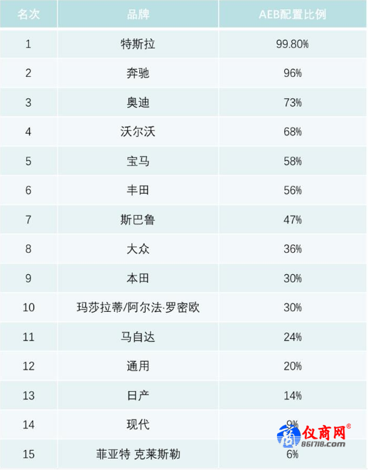 若以比例來看,在配AEB系統(tǒng)的車廠中,比率較高的前幾名并不意外均為豪華品牌。在2017年出產(chǎn)的車子中,居首位的為電動(dòng)車廠特斯拉,部分原裝AEB,另外一部分則是出廠后由云端下載系統(tǒng)開啟了AEB系統(tǒng)的功能,總計(jì)99.8%的特斯拉已具有AEB功能,包含2017年的 Model S 及SUV產(chǎn)品Model X。而德國(guó)車廠梅賽德斯-奔馳在2017年出產(chǎn)的車中,也有高達(dá)96%的車子裝有AEB,緊追在后的車廠則是 奧迪的73%、沃爾沃的68%、寶馬的58%。