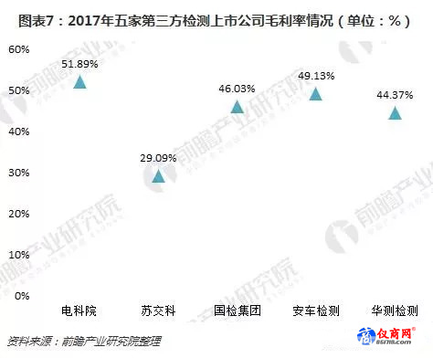毛利率來看,五家第三方檢測(cè)上市公司都處于較高水平。毛利率最低的蘇交科,也達(dá)到了29.09%;最高的是電科院,2017年毛利率為51.89%;國(guó)檢集團(tuán)、安車檢測(cè)、華測(cè)檢測(cè)毛利率都在44%以上。