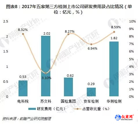 具體來看,五家第三方檢測(cè)上市公司中,研發(fā)投入最高的是蘇交科,2017年研發(fā)費(fèi)用總額達(dá)到2.02億元,但占營(yíng)收的比重只有3.10%;其余四家公司研發(fā)投入均不足2億元,且研發(fā)費(fèi)用在營(yíng)收的比重也不到9%。