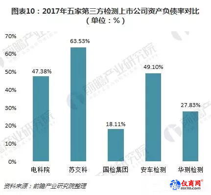 2017年,五家第三方檢測(cè)上市公司資產(chǎn)負(fù)債率普遍較低。其中,蘇交科資產(chǎn)負(fù)債率最高,為63.53%;其余四家公司資產(chǎn)負(fù)債率均在50%以下,國(guó)檢集團(tuán)資產(chǎn)負(fù)債率最低,只有18.11%,低資產(chǎn)負(fù)債率可為其提供更多資金杠桿利用空間以及業(yè)務(wù)擴(kuò)張基礎(chǔ)。