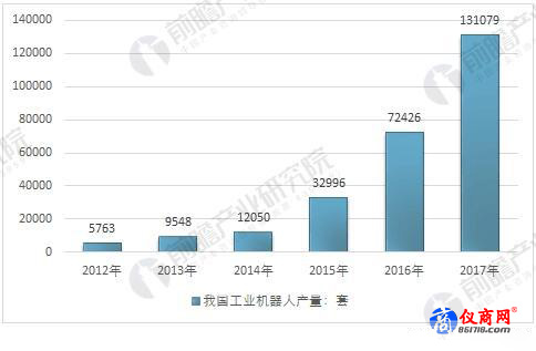 據(jù)前瞻產(chǎn)業(yè)研究院發(fā)布的《中國(guó)工業(yè)機(jī)器人行業(yè)戰(zhàn)略規(guī)劃和企業(yè)戰(zhàn)略咨詢(xún)報(bào)告》數(shù)據(jù)顯示,2017年我國(guó)工業(yè)機(jī)器人產(chǎn)量增長(zhǎng)至131079套,同比增長(zhǎng)68.1%,增速較上年同期加快33.8個(gè)百分點(diǎn)。從月度產(chǎn)量來(lái)看,各月份我國(guó)工業(yè)機(jī)器人產(chǎn)量增速均保持40%以上高速增長(zhǎng)。其中,9月份產(chǎn)量增速高達(dá)103.2%,創(chuàng)年內(nèi)最高增速;此外,我國(guó)工業(yè)機(jī)器人月度產(chǎn)量均在9000套以上。其中,9月份我國(guó)生產(chǎn)工業(yè)機(jī)器人13085套,創(chuàng)年內(nèi)最高產(chǎn)量。