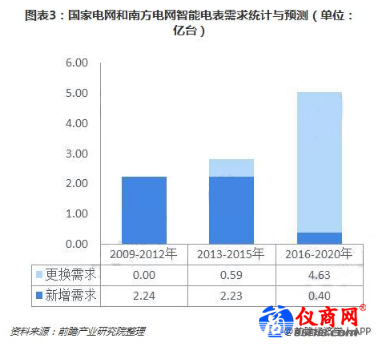 電表屬于強制檢定設(shè)備,到期需要更換,更換周期一般為5-8年。前瞻預(yù)計2016年-2020年,兩網(wǎng)公司將招標(biāo)5.03億臺智能電表,其中4.63億臺為更換需求。