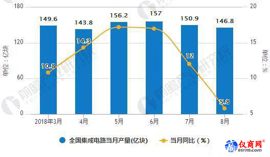 在工業(yè)新產品快速增長趨勢下,集成電路成為工業(yè)制造中的關鍵領域。據前瞻產業(yè)研究院發(fā)布的《集成電路行業(yè)市場需求預測與投資戰(zhàn)略規(guī)劃分析報告》統(tǒng)計數據顯示,2018年4-6月全國集成電路產量呈增長趨勢,2018年6月全國集成電路產量為157億塊,同比增長17%。2018年7-8月全國集成電路產量回落,2018年8月全國集成電路產量為146.8億塊,同比增長5.8%。2018年1-8月全國集成電路產量為1147.5億塊,同比增長13.4%。該產量指芯片成品,統(tǒng)計主體是年營收達到2000萬元及以上的中國大陸企業(yè)。