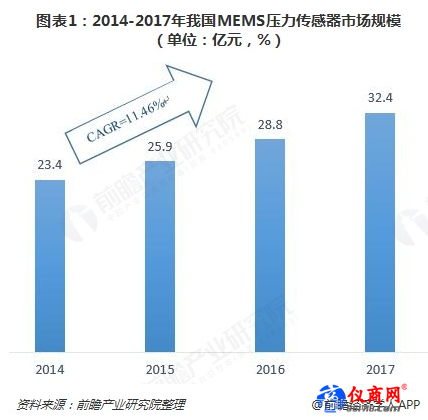 據(jù)有關(guān)數(shù)據(jù)顯示,2014-2017年,我國MEMS壓力傳感器市場規(guī)模呈穩(wěn)步上升的趨勢,其年復(fù)合增長率為11.46%。2017年我國MEMS壓力傳感器市場規(guī)模為32.4億元,同比去年增長12.5%。目前,我國MEMS壓力傳感器大約占整個(gè)MEMS傳感器規(guī)模的26%。