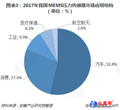 目前,汽車領(lǐng)域是MEMS壓力傳感器最大的應(yīng)用市場,消費(fèi)領(lǐng)域?yàn)榈诙髴?yīng)用市場。2017年,MEMS壓力傳感器在汽車領(lǐng)域占比53.8%,在消費(fèi)領(lǐng)域占比27.4%;在工業(yè)、醫(yī)療、航天航空領(lǐng)域內(nèi),分別占比9.9%、6.3%、2.6%。