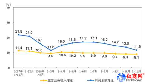 12月26日,國(guó)家統(tǒng)計(jì)局發(fā)布了2018年1-11月份全國(guó)規(guī)模以上工業(yè)企業(yè)利潤(rùn)增長(zhǎng)情況。1-11月份,全國(guó)規(guī)模以上工業(yè)企業(yè)實(shí)現(xiàn)利潤(rùn)總額61168.8億元,同比增長(zhǎng)11.8%,增速比1-10月份放緩1.8個(gè)百分點(diǎn)。其中,儀器儀表制造業(yè)實(shí)現(xiàn)利潤(rùn)總額683.1億元,同比增長(zhǎng)7.1%。