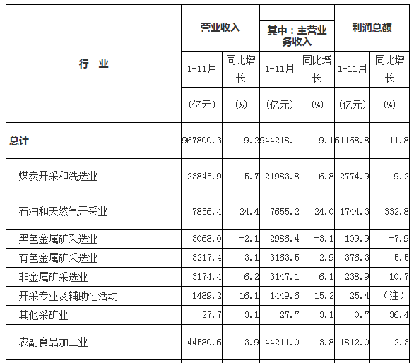 1-11月份,采礦業(yè)實(shí)現(xiàn)利潤(rùn)總額5270.4億元,同比增長(zhǎng)45.1%;制造業(yè)實(shí)現(xiàn)利潤(rùn)總額51978.9億元,增長(zhǎng)9.9%;電力、熱力、燃?xì)饧八a(chǎn)和供應(yīng)業(yè)實(shí)現(xiàn)利潤(rùn)總額3919.5億元,增長(zhǎng)4%。