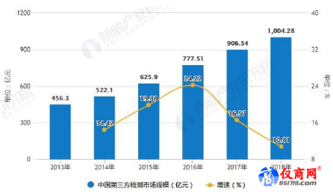 根據(jù)前瞻產(chǎn)業(yè)研究院發(fā)布的《中國第三方檢測行業(yè)發(fā)展趨勢與投資決策支持研究報告》統(tǒng)計數(shù)據(jù)顯示,2013年中國第三方檢測市場規(guī)模已達456.3億元。到了2016年中國第三方檢測市場規(guī)模增長至777.51億元,同比增長24.22%。截止至2017年中國第三方檢測市場規(guī)模增長至906.34億元,近年來維持在10%以上的較高增速。預(yù)計2018年中國第三方檢測市場規(guī)模將突破千億元大關(guān)達到了1004.28億元,我國第三方檢測市場將達到新的高度。