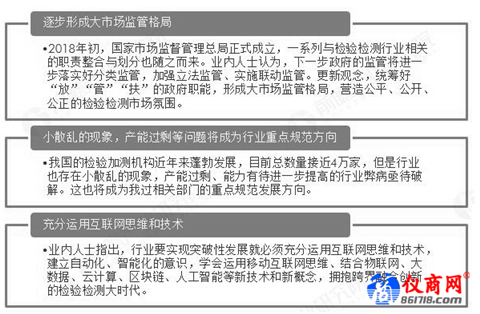 根據(jù)行業(yè)目前的發(fā)展現(xiàn)狀以及國家相關(guān)部門對于第三方檢測行業(yè)的檢測方向,未來第三方檢測行業(yè)將改變目前監(jiān)管不足的現(xiàn)狀,逐漸形成大市場監(jiān)管格局;未來第三方檢測行業(yè)的小散亂、產(chǎn)能過剩等問題將得到有效地引到和改善;此外,順應(yīng)互聯(lián)網(wǎng)化的大趨勢,未來第三方檢測機構(gòu)將更加注重互聯(lián)網(wǎng)思維和技術(shù)的應(yīng)用,助推行業(yè)實現(xiàn)突破性發(fā)展。