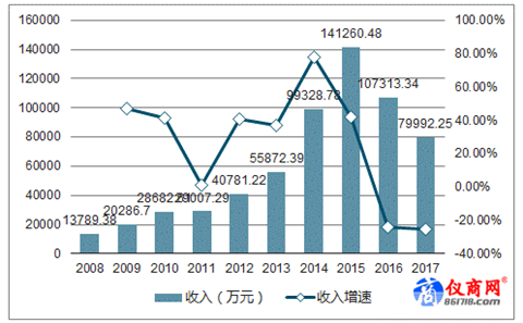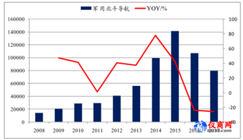 2008-2017年上市公司北斗導航國防業(yè)務(wù)收入及增速(萬元)