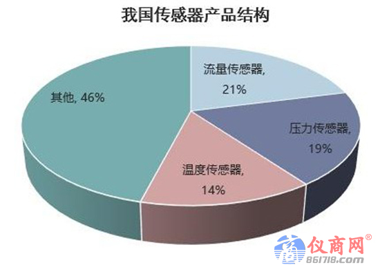 從傳感器種類來看,流量傳感器、壓力傳感器、溫度傳感器占據(jù)最大的市場份額,分別占21%、19%、14%。從應(yīng)用領(lǐng)域來看,工業(yè)、汽車電子、通信電子、消費電子四部分是傳感器最大的市場。國內(nèi)工業(yè)和汽車電子產(chǎn)品領(lǐng)域的傳感器占比約42%左右。