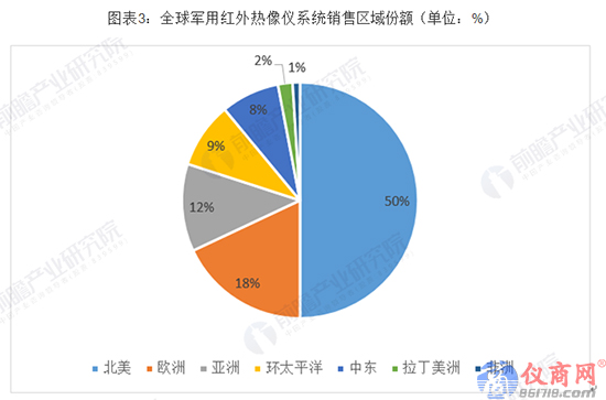 目前國際軍用紅外熱成像儀市場主要被歐美發(fā)達國家企業(yè)主導(dǎo)占據(jù),因各國保持高度軍事敏感性,限制或禁止向國外出口,大部分市場集中在歐美地區(qū)。根據(jù)Maxtech International統(tǒng)計,全球軍用紅外熱成像儀系統(tǒng)市場中,北美占50%,歐洲占18%,亞洲地區(qū)目前市場份額占12%,未來市場空間巨大。