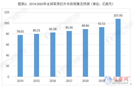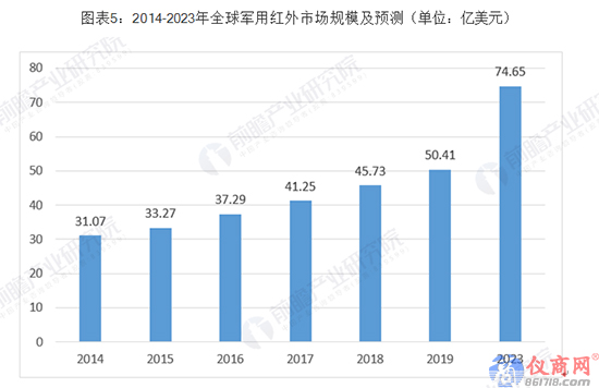 軍用紅外產(chǎn)品從上世紀70-80年代起就逐步應(yīng)用于海陸空戰(zhàn)場上,經(jīng)過多年的技術(shù)迭代及產(chǎn)品換代,目前紅外產(chǎn)品在美國、法國等發(fā)達國家軍隊的普及率較高,市場趨于穩(wěn)定。同時,西方發(fā)達國家對于紅外成像采取嚴格的技術(shù)封鎖及產(chǎn)品禁運政策,也制約了全球軍品市場規(guī)模的大幅增長。根據(jù)Maxtech International預(yù)測,2023年全球軍用紅外市場規(guī)模將達到107.95億美元。