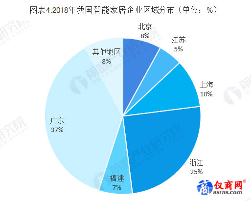 現(xiàn)階段我國(guó)智能家居領(lǐng)域參與者眾多,競(jìng)爭(zhēng)格局尚未明朗,各類企業(yè)均有機(jī)會(huì)?!?018中國(guó)智能家居產(chǎn)業(yè)發(fā)展白皮書(shū)》顯示,截至2018年底,我國(guó)智能家居企業(yè)主要分布在東部地區(qū),其中廣東地區(qū)分布的企業(yè)占比最高,達(dá)到37%,其次是浙江省,分布的智能家居企業(yè)數(shù)量占比達(dá)到25%。