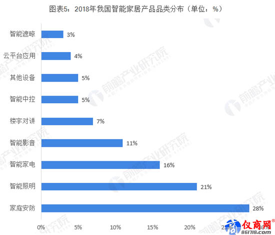 而這些企業(yè)生產(chǎn)的智能家居品類中,家庭安防、智能照明、智能家電市場(chǎng)份額占比較高,分別為28%、21%、16%。此外智能影音、樓宇對(duì)講等占比均在5%以上。