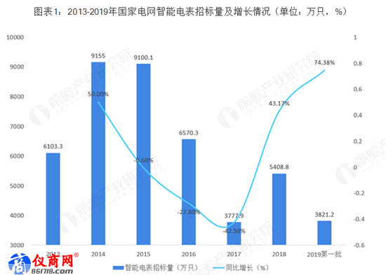 2019年6月,國(guó)家電網(wǎng)公告了2019年第一次電能表及用電信息采集設(shè)備招標(biāo)中標(biāo)結(jié)果。根據(jù)招標(biāo)中標(biāo)結(jié)果顯示,智能電表招標(biāo)量有所增長(zhǎng),隨著我國(guó)智能電網(wǎng)建設(shè)的快速實(shí)施以及電能表輪換工作的開展,作為智能電網(wǎng)用電環(huán)節(jié)的重要組成部分,智能電表的需求將在未來一段時(shí)期內(nèi)持續(xù)增長(zhǎng)。2019年國(guó)家電網(wǎng)第一批次對(duì)智能電表的招標(biāo)量達(dá)到3821.2萬(wàn)只,較2018年第一批次招標(biāo)量同比上升74.38%;2019年第一批次智能電表的招標(biāo)數(shù)量已經(jīng)超過上年智能電表招標(biāo)總量的70%。