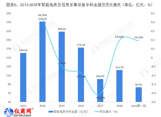 從中標(biāo)金額來看,2014年為智能電表及用電信息采集設(shè)備的高峰期,中標(biāo)金額達(dá)到峰值,為231.34億元,隨后智能電表及用電信息采集設(shè)備市場(chǎng)趨于飽和,中標(biāo)金額逐漸下降。2017年,由于更大范圍普及和換表需求,中標(biāo)金額又開始呈增長(zhǎng)趨勢(shì),2019年第一批次中標(biāo)金額為82.92億元,較上年同比增長(zhǎng)19.1%,預(yù)計(jì)2019年我國(guó)智能電表需求量及市場(chǎng)規(guī)模將進(jìn)一步擴(kuò)大。