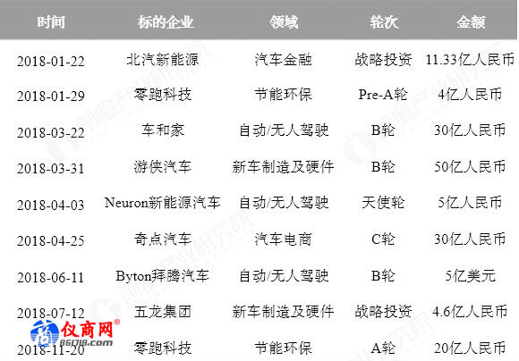 2018年中國新能源汽車行業(yè)部分重點投融資事件匯總情況