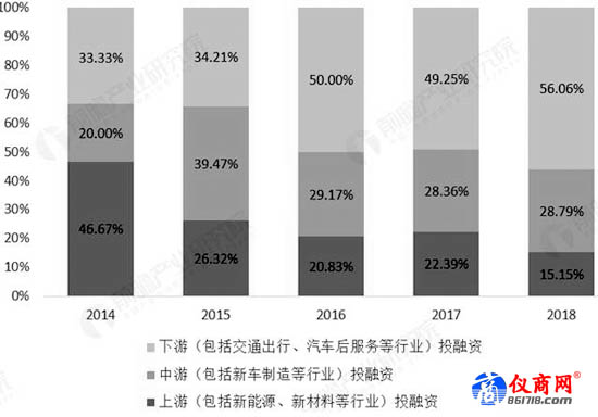 2018年中國新能源汽車行業(yè)投融資事件產(chǎn)業(yè)鏈上中下游項目占比統(tǒng)計情況
