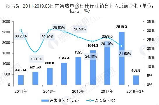 從產(chǎn)業(yè)鏈整體看,集成電路設(shè)計領(lǐng)域?qū)儆谳p資產(chǎn)處于產(chǎn)業(yè)上游,毛利率較高。美國為主的公司處于領(lǐng)先地位,國內(nèi)起步較晚,目前仍然處于追趕地位。2016-2019年間,設(shè)計領(lǐng)域保持著20%以上的增速。