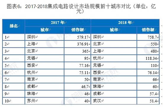 另外,分地區(qū)看,2018年集成電路設(shè)計市場收入排名前十城市市場規(guī)模占整體市場規(guī)模為92.41%,較上期上升近8個百分點;收入排名前三的分別為深圳、北京、上海,市場占有率為71%,較上期上升7.29個百分點,整體看,集成電路設(shè)計產(chǎn)業(yè)區(qū)域集中度進一步提高。