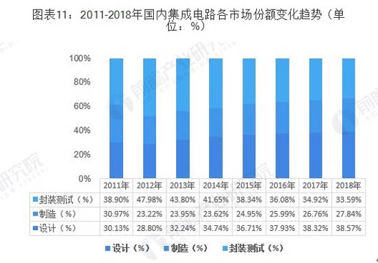 同時還需看到,多年間,我國集成電路產(chǎn)業(yè)鏈結(jié)構(gòu)逐步向上游擴展。2018年,中國集成電路設(shè)計業(yè)銷售收入2519億元,所占比重從2011年30.13%增加到2018年的38.57%;制造領(lǐng)域則從2011年的30.97%的比重下滑到2018年的27.84%;封裝測試領(lǐng)域也呈現(xiàn)出下滑趨勢,從2011年的38.90%下滑至2018年的33.59%。整體看,經(jīng)過多年發(fā)展,集成電路產(chǎn)業(yè)附加值有所上升。