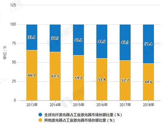2013-2018年全球光纖激光器占工業(yè)激光器市場份額比重統(tǒng)計情況