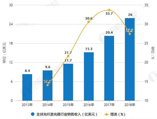 2013-2018年全球光纖激光器行業(yè)銷售收入統(tǒng)計及增長情況