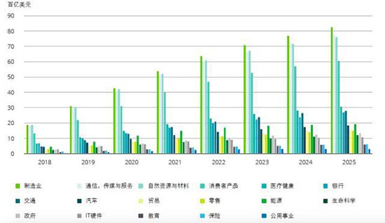 全球人工智能市場規(guī)模(按行業(yè)分類)。數(shù)據(jù)來源:德勤