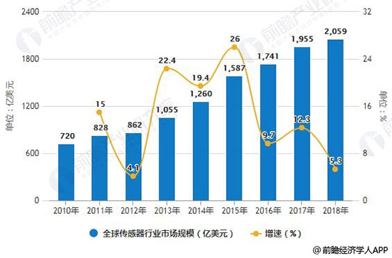 1、現(xiàn)狀:2018年全球傳感器行業(yè)市場規(guī)模突破2000億