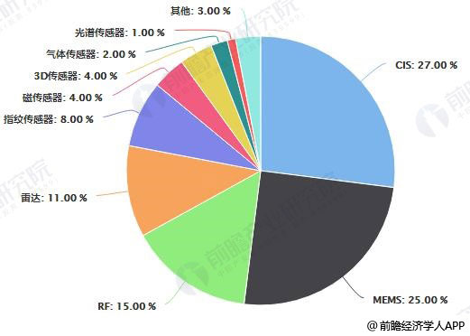 從產(chǎn)品結(jié)構(gòu)來看,2018年全球傳感器市場中CMOS圖像傳感器(CIS)占據(jù)傳感器市場的27%,MEMS傳感器占25%的市場,而單一材料傳感器中電壓式指紋識(shí)別傳感器占比達(dá)8%。另外射頻傳感器和雷達(dá)傳感器在通訊、汽車、軍事上有著遠(yuǎn)距離探測和信息傳遞的應(yīng)用,分別占比15%和11%。