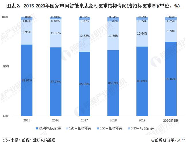 智能電能表產品結構方面,2015-2019年,國家電網(wǎng)智能電表招標中,2級單相智能表招標需求一直占據(jù)主要比重,達到85%以上水平。其次為1級三相智能表,占比在10%上下浮動。0.5S三相智能表和0.2S三相智能表招標需求不到2%。2019年2級單相智能表招標需求為6510.74萬只,同比增長40%,占比達到88.09%。1級單相智能表招標需求為786.31萬只,同比增長26%,占比達到10.64%;0.5S三相智能表招標需求為92.62萬只,同比增長1%,占比達1.25%??芍獓译娋W(wǎng)智能電表招標產品需求中,快速增長,需求較大的仍是2級、1級的智能電表。