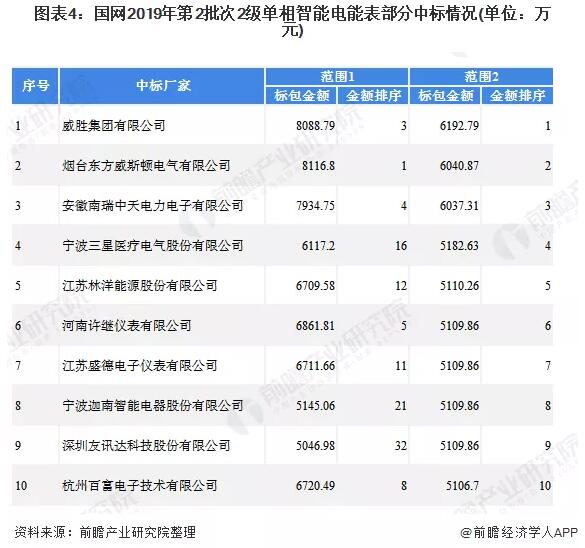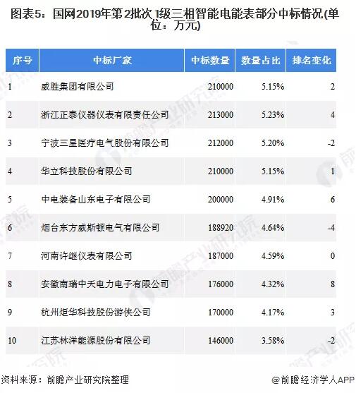 智能電表中標主體構成方面,國家電網(wǎng)有限公司2019年第2批次電能表及用電信息采集設備招標采購推薦的中標候選人中,較第1批有較大變化。有2家近五年未進入過前10名的企業(yè)在第2次招標中進入前10名企業(yè);第1名市場份額環(huán)比微幅增加0.03個百分點,最后1名市場份額環(huán)比減少0.09個百分點。其中威勝集團有限公司、煙臺東方威斯頓電氣有限公司、安徽南瑞中天電力電子有限公司中標金額位于前列。