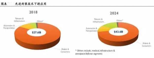 2018 年先進封裝占整個封裝市場 42.1%,預計 2018-2024 年先進封裝年均 復合增速為 8.2%,傳統(tǒng)封裝產(chǎn)品增速僅為 2.4%,到 2024 年先進封裝與傳統(tǒng)封 裝市場規(guī)模將持平。