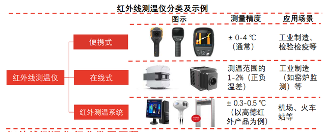 據(jù)頭豹研究院整理,常見(jiàn)的紅外線測(cè)溫產(chǎn)品可以分為便攜式、在線式以及紅外測(cè)溫系統(tǒng)三類。其中,便攜式紅外線測(cè)溫儀應(yīng)用場(chǎng)景廣泛,在線式紅外線測(cè)溫儀主要應(yīng)用于工業(yè)制造,紅外測(cè)溫系統(tǒng)主要應(yīng)用于車站、機(jī)場(chǎng)、醫(yī)院、大型工廠等人員密集場(chǎng)景的體溫篩查。