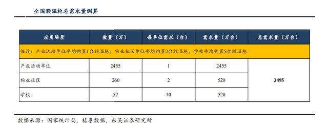 據(jù)東吳證券對(duì)額溫槍在產(chǎn)業(yè)活動(dòng)單位、物業(yè)社區(qū)和學(xué)校的需求空間進(jìn)行的測(cè)算:以全國(guó)人口為13.93億計(jì),全國(guó)額溫槍的人均保有量約為0.03臺(tái)/人,假設(shè)全球額溫槍的人均保有量為0.02臺(tái)/人,以全球人口為75.94億計(jì),則全球額溫槍市場(chǎng)的需求量約為1.52億臺(tái),需求空間十分廣闊。