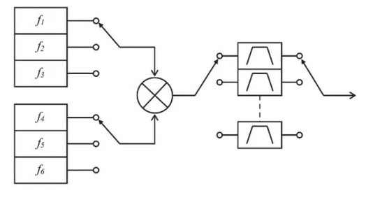 直接模擬發(fā)生器是通過(guò)混合一些固定頻率的基頻信號(hào),然后用開關(guān)濾波器實(shí)現(xiàn)的,如圖2所示。直接模擬發(fā)生器的主要優(yōu)點(diǎn)是開關(guān)速度極快,從微秒到納秒不等。另一個(gè)顯著的優(yōu)點(diǎn)是能夠產(chǎn)生低相位噪聲,這是由于使用了與基頻源相比可以忽略的低殘留噪聲的組件。因此,直接模擬發(fā)生器的相位噪聲主要取決于可用固定頻率源的噪聲,并且可能非常低。該拓?fù)涞闹饕秉c(diǎn)是頻率覆蓋范圍有限,步長(zhǎng)小,成本高??梢酝ㄟ^(guò)使用更多的基頻和/或混頻器級(jí)來(lái)增加輸出頻率的數(shù)量。然而,這會(huì)迅速增加設(shè)計(jì)復(fù)雜性和整體組件數(shù)量。另一個(gè)嚴(yán)重的問(wèn)題是混頻器級(jí)產(chǎn)生大量不希望的雜散產(chǎn)物。這些雜散必須被徹底過(guò)濾,這對(duì)于特定發(fā)生器頻率計(jì)劃開發(fā)來(lái)說(shuō)是一個(gè)嚴(yán)重的挑戰(zhàn)。