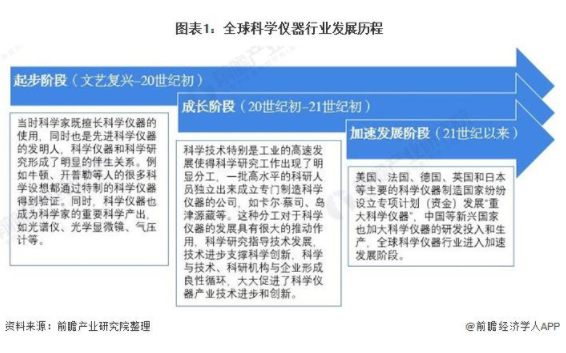 全球科學(xué)儀器的發(fā)展可以追溯到文藝復(fù)興時期,當(dāng)時科學(xué)家既擅長科學(xué)儀器的使用,同時也是先進(jìn)科學(xué)儀器的發(fā)明人,科學(xué)儀器和科學(xué)研究形成了明顯的伴生關(guān)系。