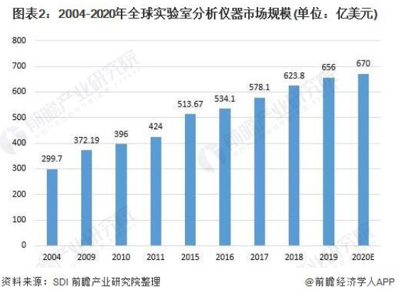 實驗室分析儀器作為科學(xué)儀器的重要類目之一,其全球規(guī)模的逐年增長一定程度上可以反映全球科學(xué)儀器市場規(guī)模的變化情況??紤]到近年來全球科研投入不斷增加,科研活動愈發(fā)頻繁,初步推斷 2020 年全球科學(xué)儀器市場規(guī)模也呈現(xiàn)明顯的增長態(tài)勢,約為 670 億美元。