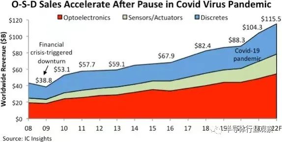 在Covid-19 大流行于 2020 年開(kāi)始導(dǎo)致全球封鎖和全球經(jīng)濟(jì)嚴(yán)重衰退一年后,許多終端市場(chǎng)需求反彈和供不應(yīng)求的零件價(jià)格大幅上漲。然而,由于 CMOS 圖像傳感器增長(zhǎng)乏力,導(dǎo)致2021 年的光電銷(xiāo)售增長(zhǎng)有所放緩,部分原因是美國(guó)和中國(guó)之間的貿(mào)易摩擦。