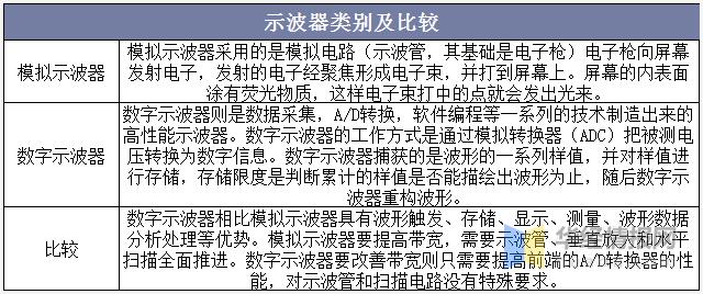 示波器包括數(shù)字示波器和模擬示波器,數(shù)字示波器在市場規(guī)模、應用范圍上均占主導地位。其中數(shù)字示波器可以分為數(shù)字存儲示波器(DSO),數(shù)字熒光示波器(DPO)和采樣示波器。